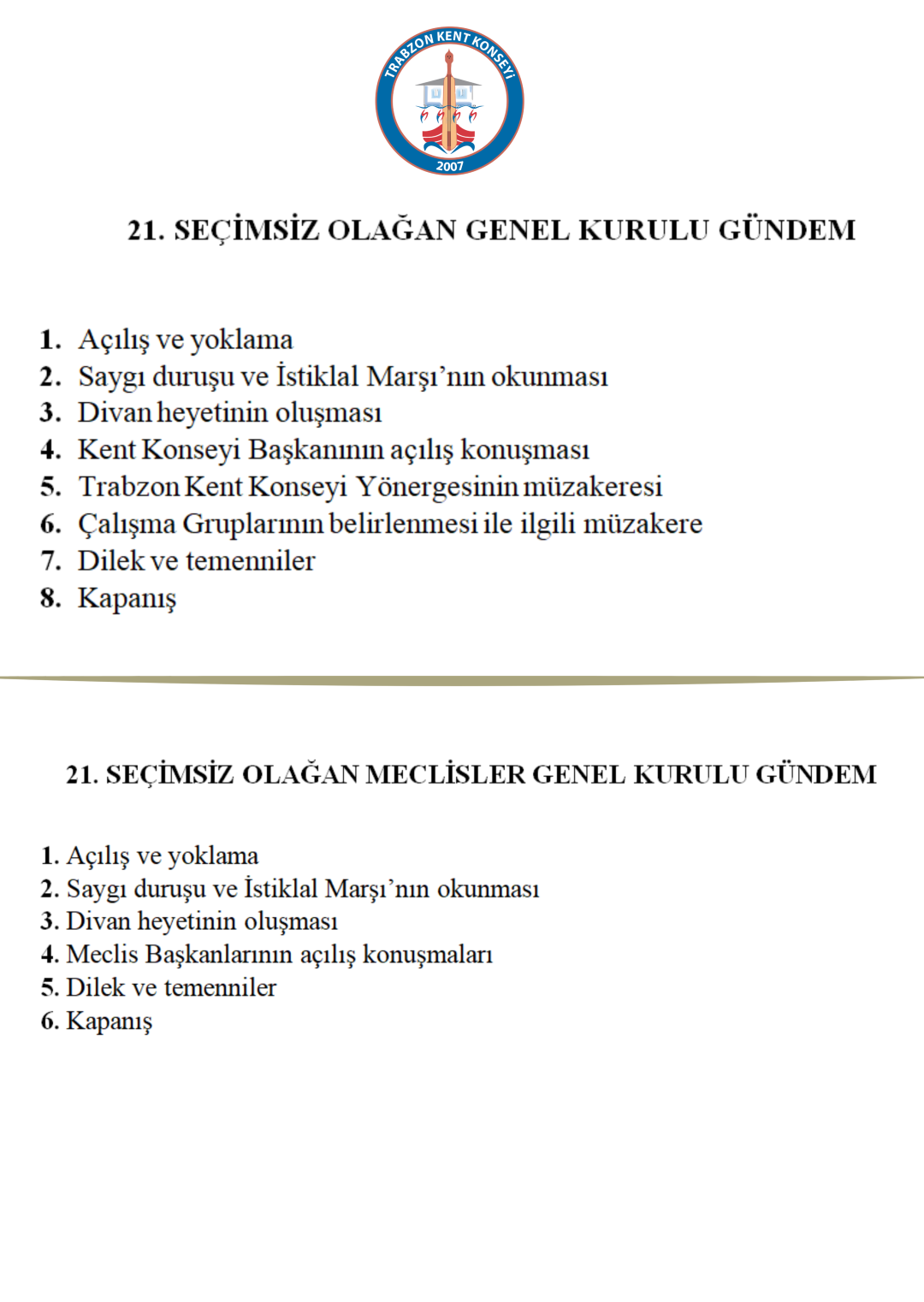 21.SEÇİMSİZ OLAĞAN GENEL KURUL GÜNDEM
